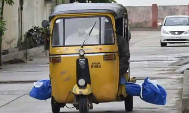 Xe Tuviduk vận chuyển hài cốt của nạn nhân Covid-19 đến nghĩa trang. Vào ngày 10 tháng 7, tại Nizamabad, bang Telangana. Ảnh: Hindustan Times-quan chức địa phương C Narayana Reddy cho biết ông đã ra lệnh điều tra vụ việc và đình chỉ các nhân viên có liên quan. Theo ông, chỉ có hai xe cứu thương tại Bệnh viện Nissanbad xử lý các thi thể. Vào ngày xảy ra vụ việc, bốn người chết, ba người chết ở Covid-19. Xe cứu thương đã đưa hai thi thể và hai người kia đã chật cứng và sẵn sàng điều trị. Bệnh viện nói với người thân của bệnh nhân rằng họ phải đợi thêm một giờ nữa, nhưng họ muốn sử dụng tuk tuk của họ để vận chuyển cơ thể.